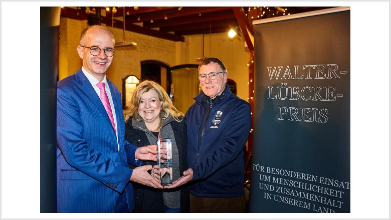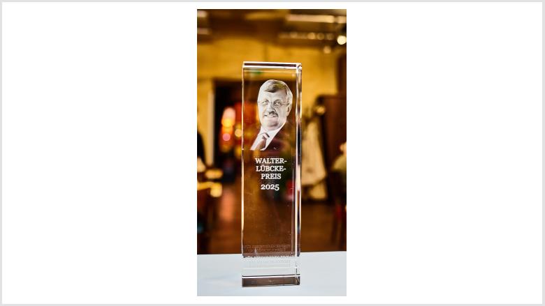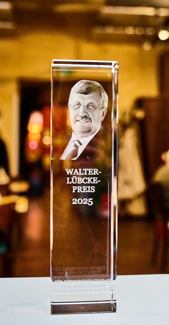 Der Walter-Lübcke-Preis, ein massiver Glasquader, geschaffen von einem Dresdner Künstler, zeigt einen offenen wie optimistischen Walter Lübcke in dreidimensionaler Ansicht, und dazu die Inschrift „Für besonderen Einsatz um Menschlichkeit und Zusammenhalt in unserem Land“.